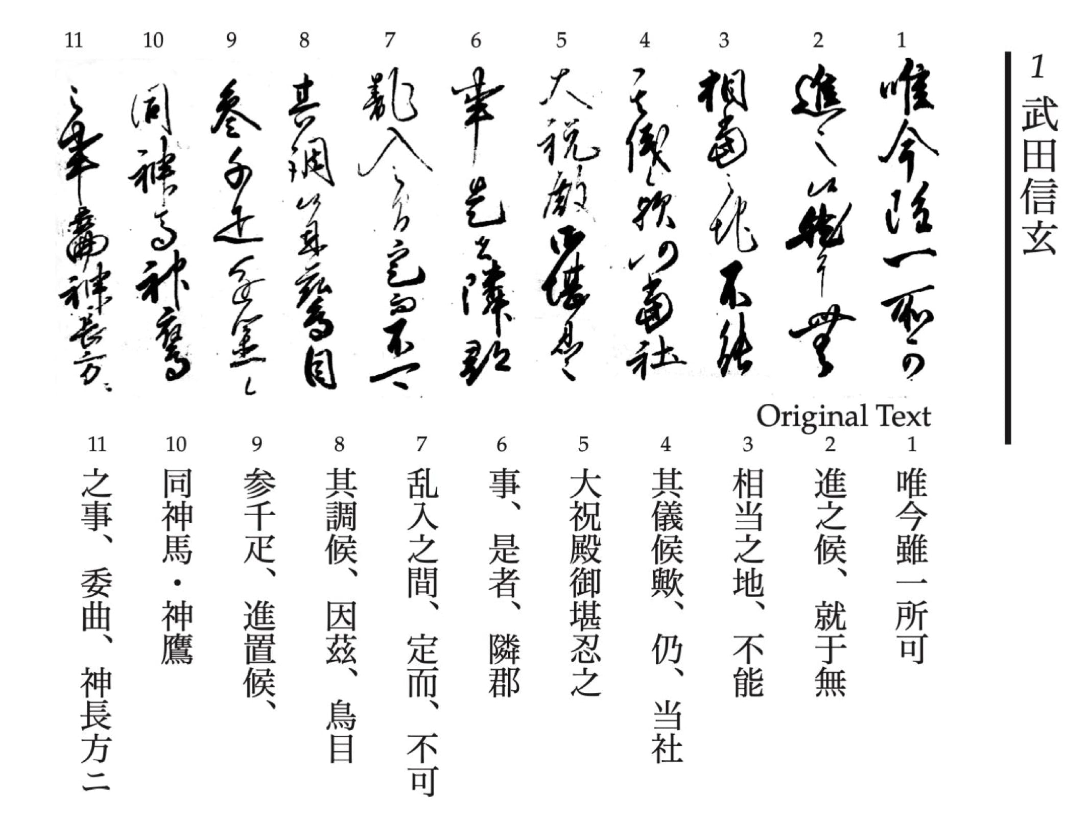 Here is a sample of one letter, by the fierce warlord Takeda Shingen. One of the most respected and feared warlords of the sixteenth century, Shingen wrested control of the province of Kai from his own father, and relentlessly expanded his territory until his sudden death in 1573. A skilled swordsman and perceptive strategist, Shingen is well known for his military activities and effective rule of his domain.
